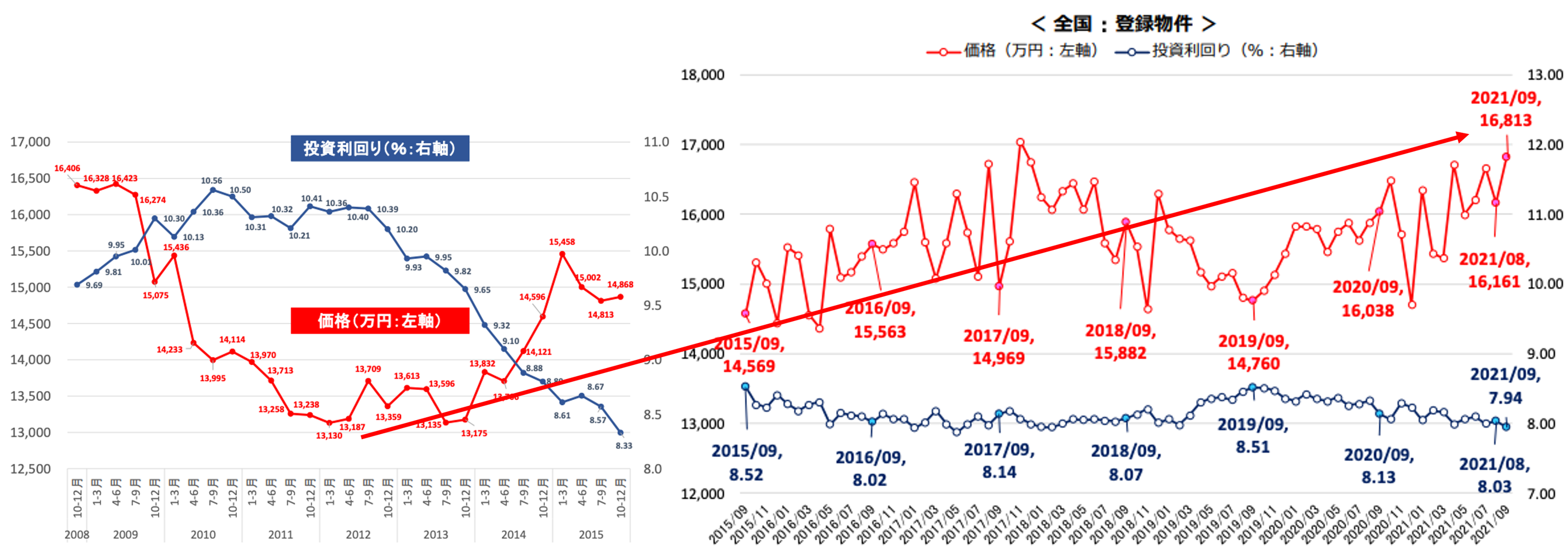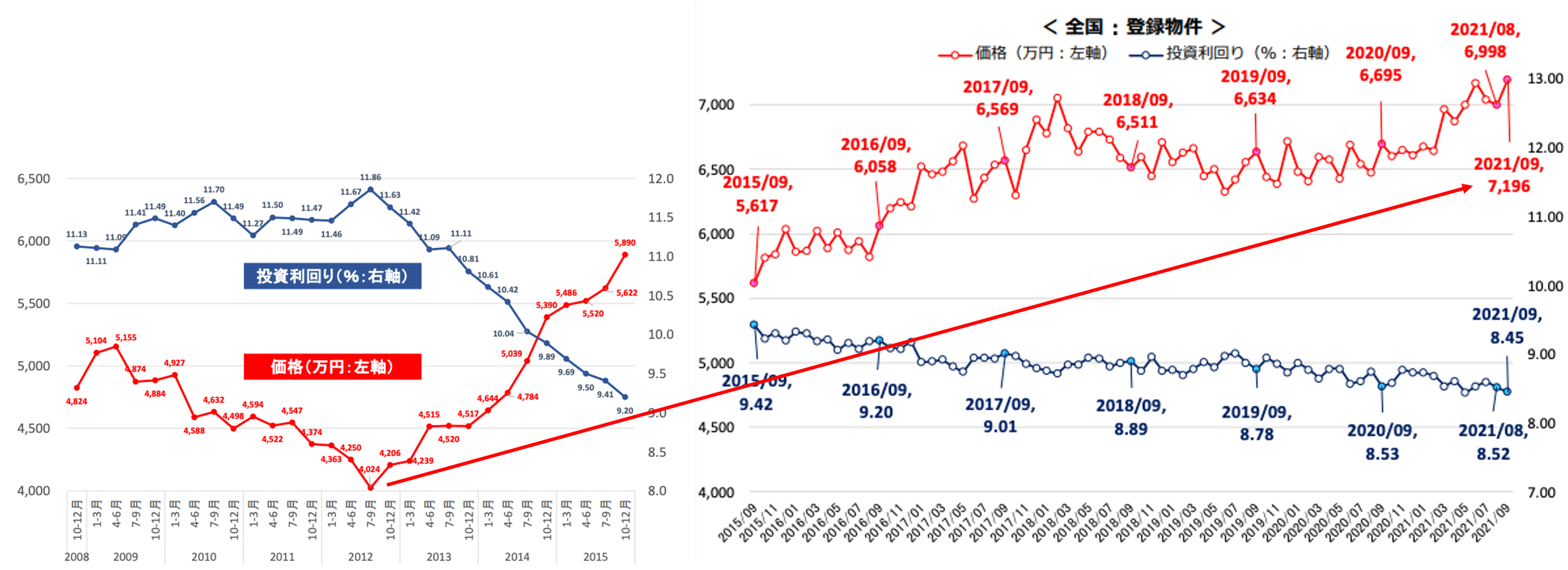 2011年~2012年に底値をつけていた1棟アパートや1棟マンションは、現在高止まりしている状態です。