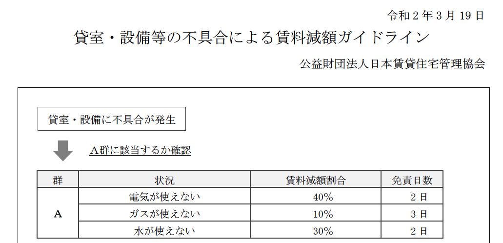 「公益財団法人日本賃貸住宅管理協会」の出している「貸室・ 設備等の不具合による賃料減額ガイドライン」に以下のようにあります。