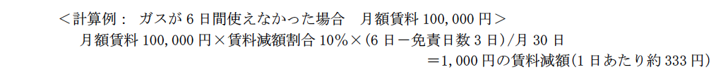 「ガスが使えない」 → 賃貸減額割合「10%」、免責日数「3日」