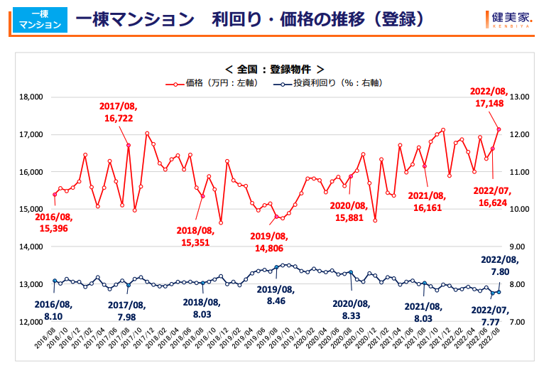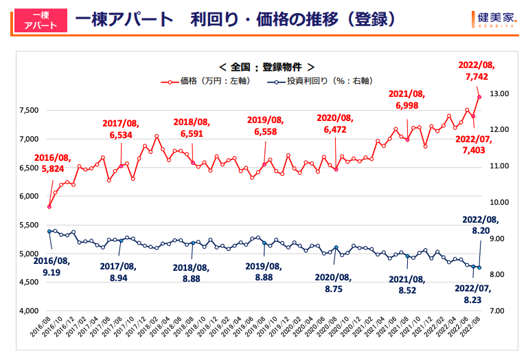健美家のレポート「不動産投資レポート2022年09月」を見ても、以下に収益物件が高止まりしているかが分かります。1棟アパートの上がりようはすごいですね。。。汗