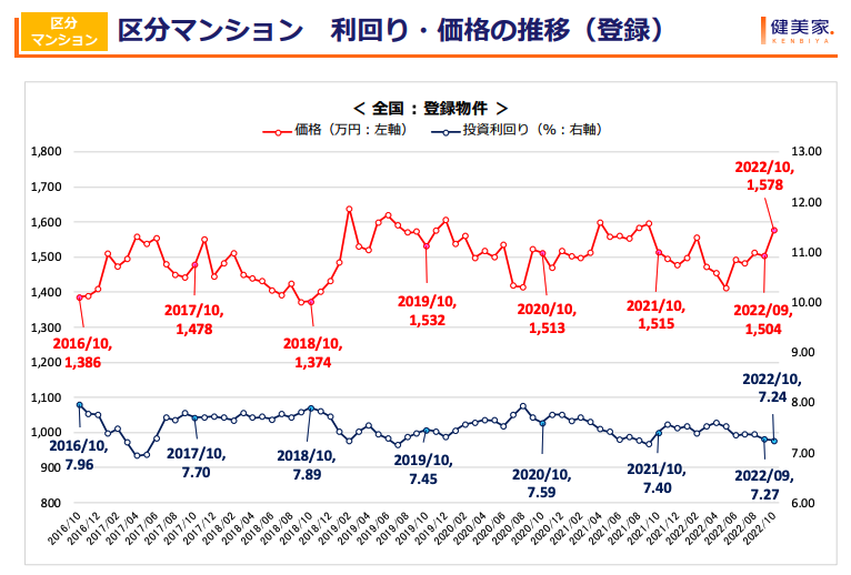 今はご存知の通り、収益不動産は高止まりしています。見てください、この区分マンション価格の推移を!ここ5年ほどまったくと言っていいほど下がっていません。むしろ価格は上がっています。