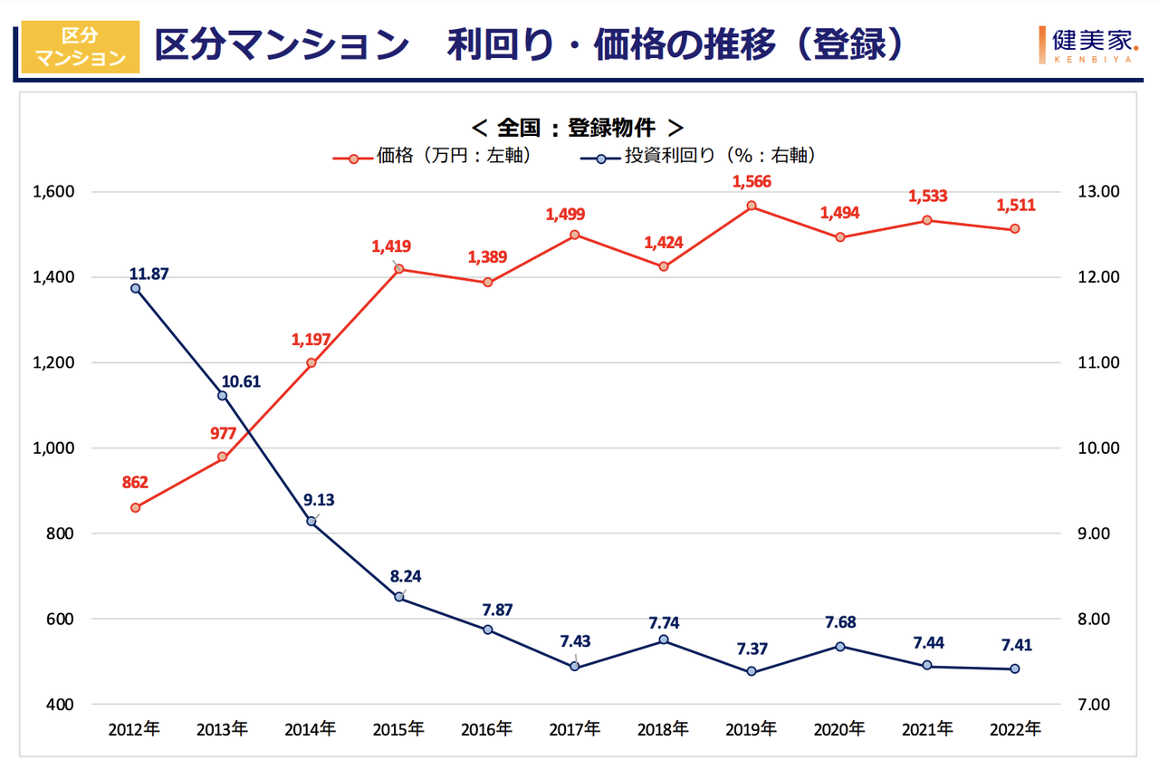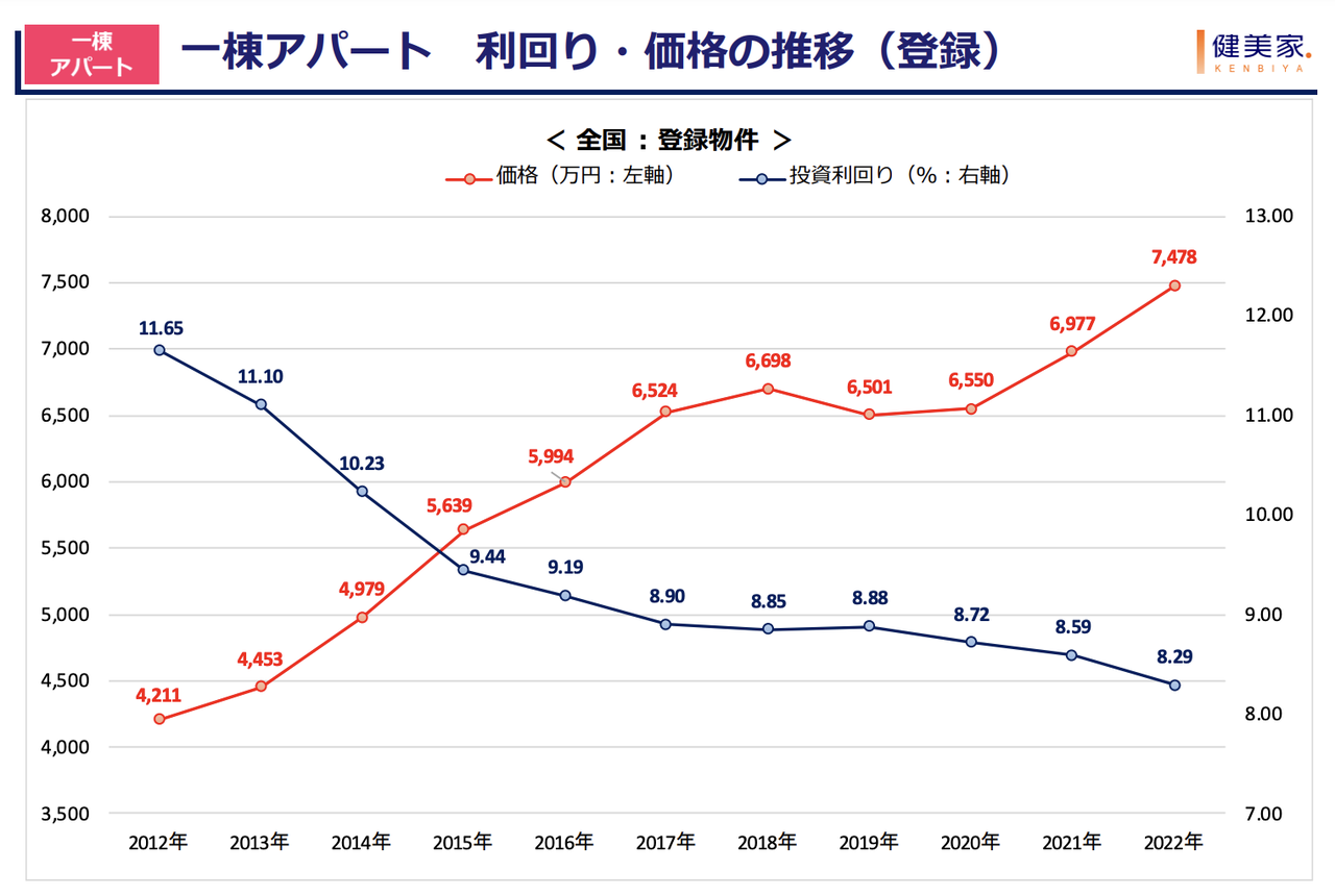 健美家の最新のレポート「収益物件 市場動向 年間レポート<2022年1月~12月期>」でも、収益物件が高値で推移していることが分かります。1棟マンション、1棟アパート、区分マンション、いずれも同様の傾向です。