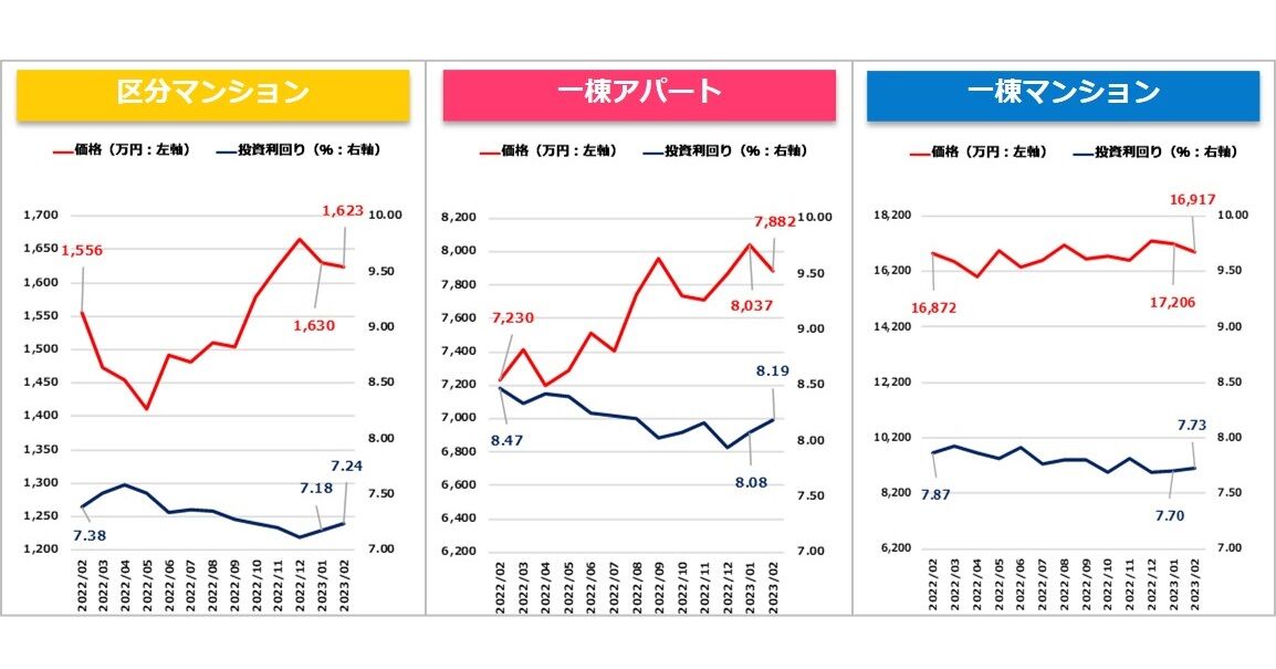 1棟マンションは高値止まり。区分と1棟アパートはここにきてまた値上がっているようです。恐ろしいですね。。。
