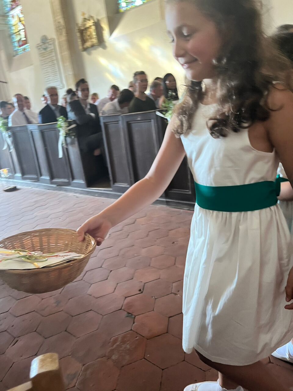 フランスでは日本のようにご祝儀を手渡す慣習は無いのですが、式の最後の方に子どもたちが小さなカゴを持って式場を周ります。