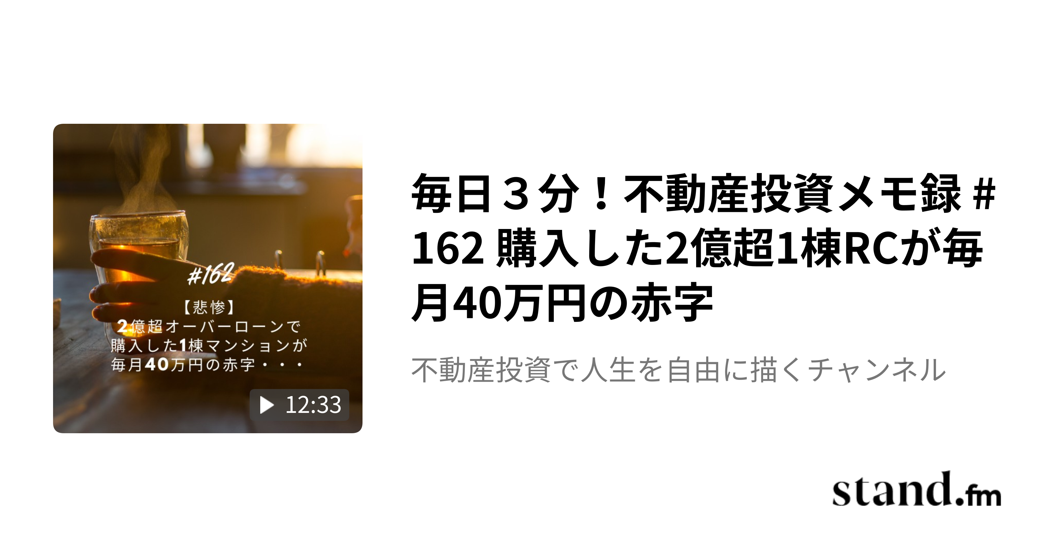 フォロワー160名突破しました!ぐんぐん増えています!! 上記の楽待コラムの内容をStandFM(スタエフ)で音声解説しており、大好評頂いてます。