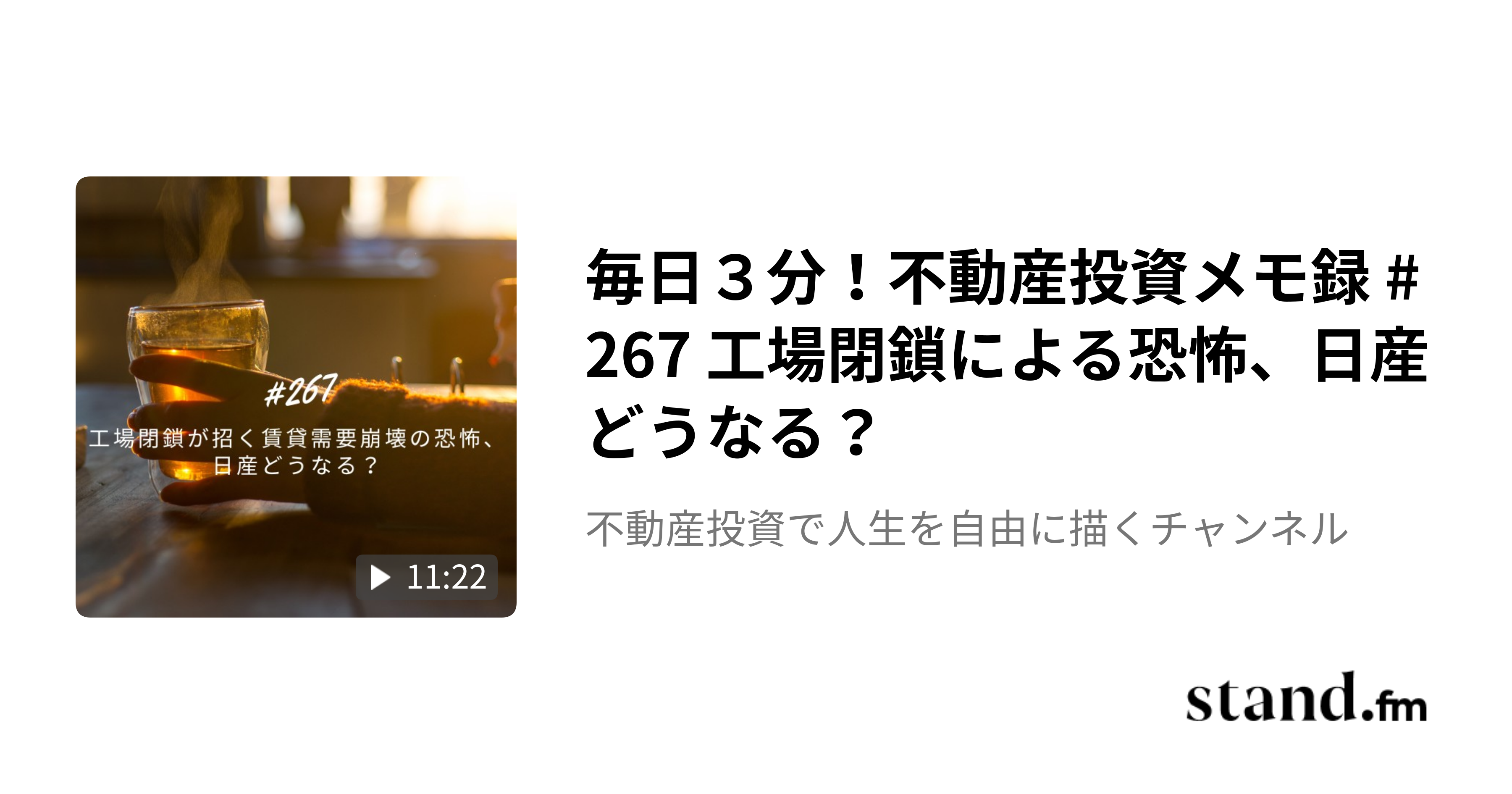 フォロワー220名突破しました!ぐんぐん増えています!! 上記の楽待コラムの内容をStandFM(スタエフ)で音声解説しており、大好評頂いてます。