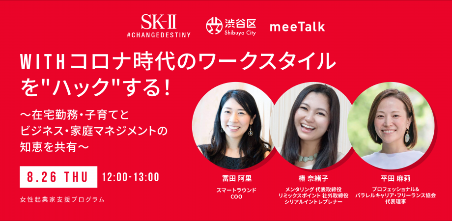 8/26 ランチタイムトーク!【Withコロナ時代のワークスタイルを"ハック"する!〜在宅勤務・子育てとビジネス・家庭マネジメントの知恵を共有〜】 #女性起業家支援プログラム #CHANGEDESTINY @SKII_Japan × @meetalkorg