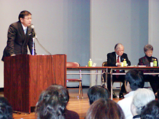 初めに登壇したのは砂川氏。外務省在職時の87年、大韓航空機事件の主犯金賢姫をバーレーン空港で拘束。その後、オーストリアへ行き、北朝鮮大使館で会談した経験を話した。その中で「日本政府は北朝鮮に対して経済措置をとる決断力がなく、ふがいなさを感じる。北朝鮮に対する日本国内や国際世論の高まりが金正日への一番の脅威となる」と話した。