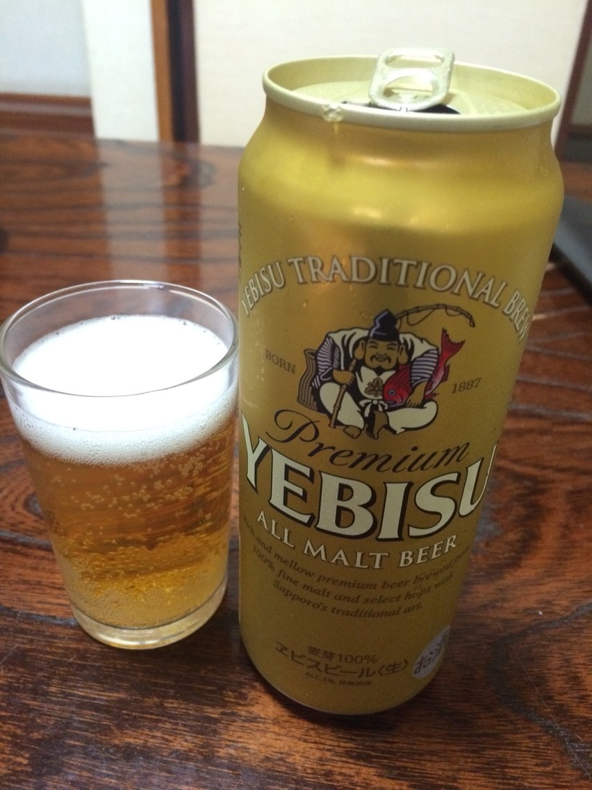 冷蔵庫に入れたビールをあけ、旅館のコップで飲む。
