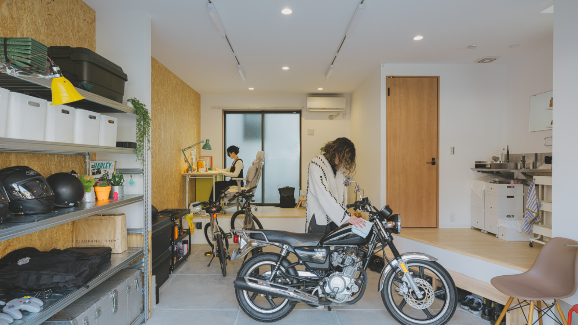 「バイクに関するもの以外にも、趣味のキャンプ道具やDIYの工具、植物などがしっかり収納・ディスプレイできるようにしています」(kinocoさん)