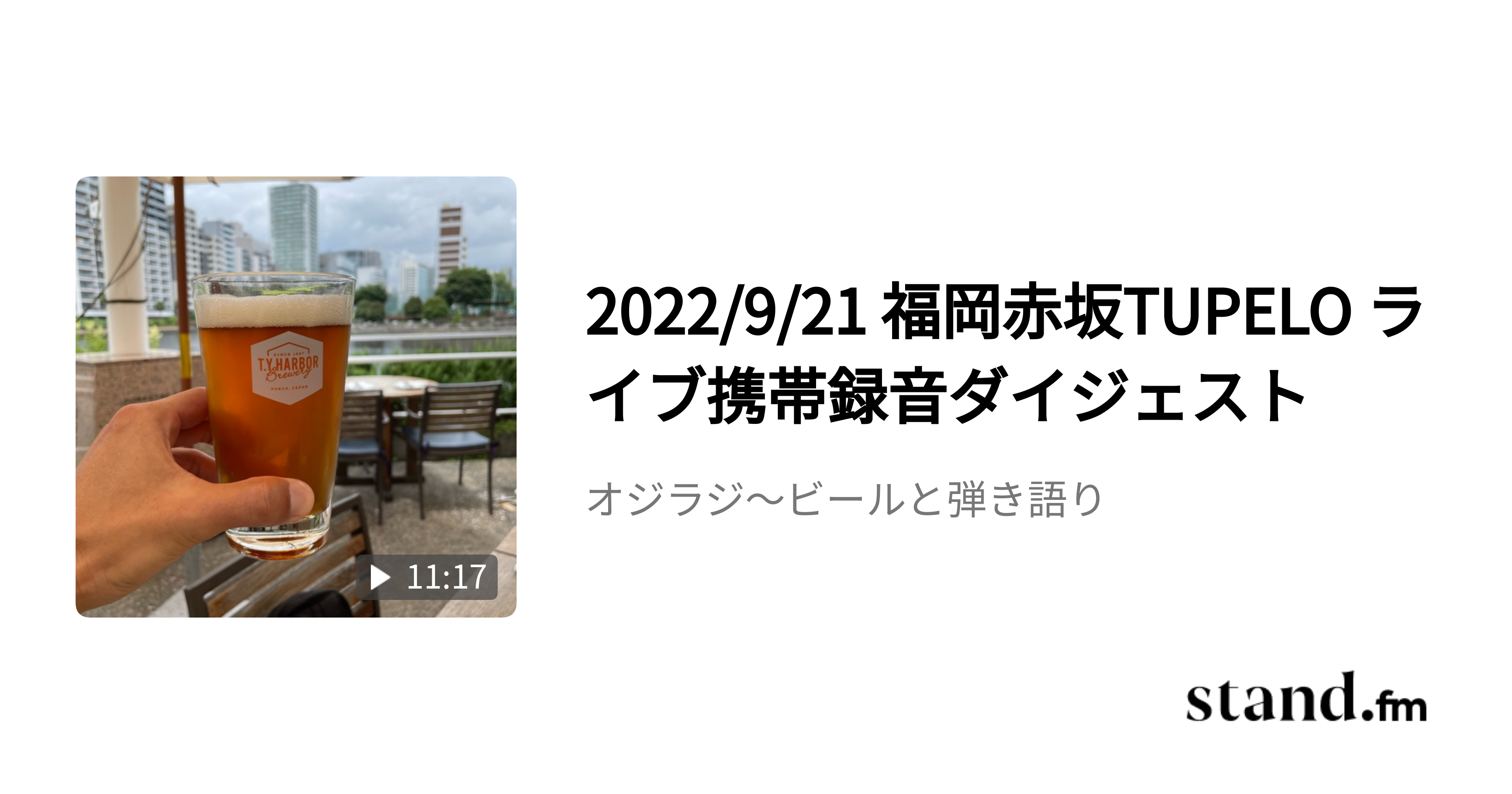 マンサムありがとう!ダイジェスト音源昨日もありがとうございましたー‼️良い夜やったなー✨10分程度のダイジェストにしてみました。https://stand.fm/episodes/632bc63ae2d9dffbf2857bbf2022/9/21 福岡赤坂TUPELO ライブ携帯録音ダイジェスト - オジラジ〜ビールと弾き語り | stand.fm2022/9/21に福岡赤坂TUPELOで開催されたマンスリーライブ。 ベースレスの飲み会バンドです🍺 携帯を客席に置いての隠し録りスタイル。 現場にいると許される空気感🍺🍺、、ラジオに耐えれるか、、?? どうぞお聴き流し下さい。 1.Stunning/江頭つとむ 2.笑顔と明日/大角太郎 3.Beer/江頭つとむ…stand.fm
