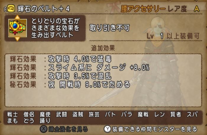 毒は「破毒リング+宝珠+輝石のベルト」でも100%にすることが可能ですが、アタッカーのバトマスの場合は火力確保の方が重要ですので、スライム8%の系統ベルトを採用。