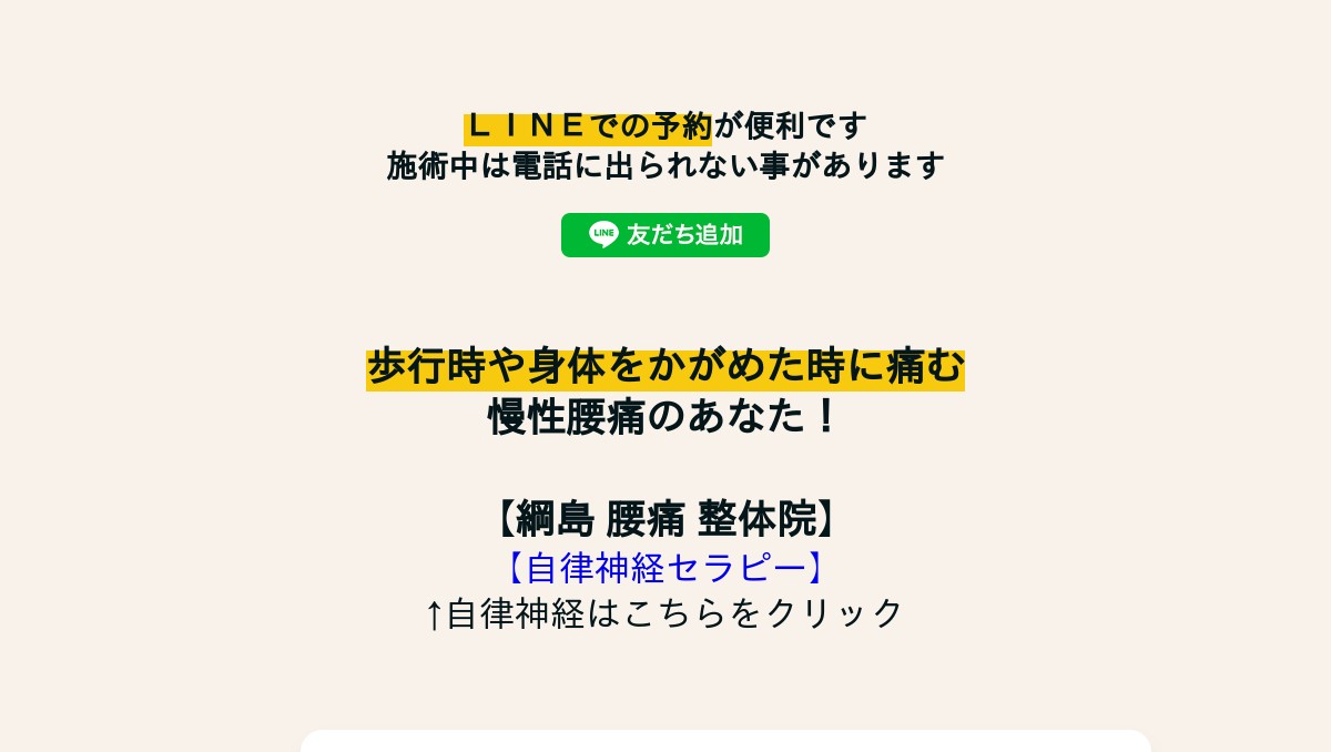 初回限定1,980円!綱島で狭窄症・座骨神経痛を改善ゆるめるだけじゃない!クスリに頼らずしっかりと原因を毎回探して改善へ。初回限定1,980円! 狭窄症や座骨神経痛などの腰痛に特化しています。疲れが取れない、ダルイなどもすぐに連絡してください。youtuuseitai.hp.peraichi.com