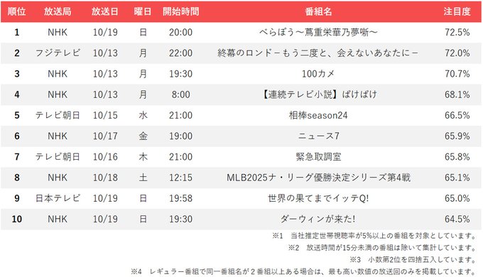 マイナビニュース・エンタメ【公式】@mn_enta 草なぎ剛主演『 終幕のロンド』が 高数値でスタート=週間テレビ番組注目度ランキング #終幕のロンド #草なぎ剛 #大谷翔平 #イッテQ #REVISIO news.mynavi.jp/article/202510… pic.x.com/qjxPicZfaW