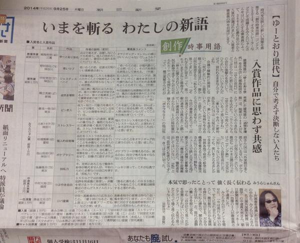 朝日新聞9/25朝刊。創作時事用語の入賞作が紹介されてます。 最優秀賞は「ゆーとおり世代」。審査員みうらじゅんさんのコメント「オヤジギャグ スレスレの感じがいいんじゃないでしょうか?」