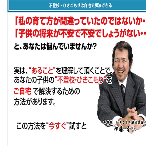 "不登校・ひきこもり・いじめ・家庭内暴力など あなたの悩みを解決します。伊藤幸弘が、約28年間、2000人以上の家族を救ってきた経験と知恵をこのDVDに詰め込みました。・・・・・≫続きはこちら