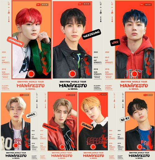 ENHYPEN(ジョンウォン、ヒスン、ジェイ、ジェイク、ソンフン、ソヌ、ニキ)は先月27日から2日まで7日間にわたって公式SNSに「ENHYPENWORLDTOUR『MANIFESTO』(以下「MANIFESTO」)ソウル公演のメンバー別ポスターを順に掲載した。