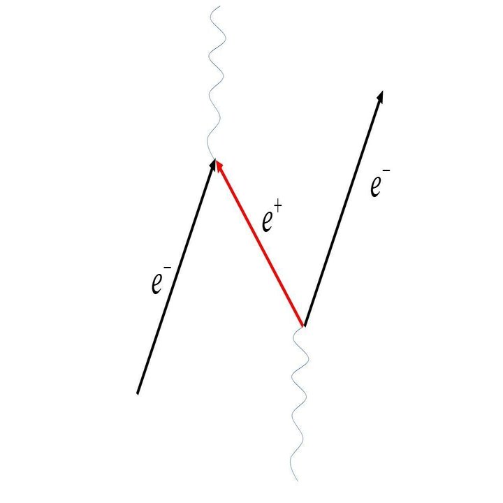 ウィーラーは時間順方向に進む陽電子をタイムマシンのように時間を逆行する電子だと解釈しようとしました。すると異なる粒子は必要なくなり、図1のようにただ1つの粒子だけが時空の中をうろうろしているだけに見えます。世界中にある全ての電子と陽電子は、時間を進んだり戻ったりする、ただ1つの粒子に過ぎないと、彼は夢想したのです。時間を行ったり来たりする1つの粒子の運動を、ある時刻の断面で見たときに、沢山の電子と陽電子が出てくるというアイデアでした。これならば、なぜ全ての電子と陽電子が同じ質量、同じスピンを持つのかも自明になります。相対論的な場の理論では、時間反転で電場の向きは変わるので、電荷が反転するのも自然に見えます。