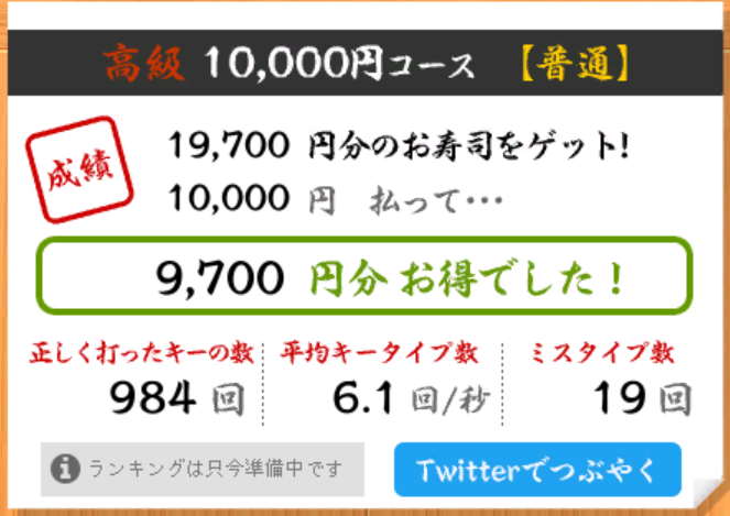 ムムムムム悔しい。 悔しい。どっちもあと一文字が打てれば、大台に乗っていたのに……。一皿じゃありません。一文字なのです……。なぜか手がプルプル震えてしまって押せませんでした。遂に遂にと気持ちだけ先行してしまいました。良くない癖ですね。まあ、そんな日もあるでしょう。むしろ前向きの捉え方でお気楽に楽しもうっと!
