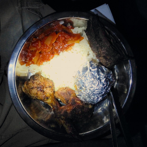 白米に骨付きチキン、噛み応え充分な分厚いローストビーフに缶詰めのミートソース。