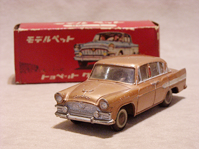 uenowjapanコメント3 当時は輸出最盛期で作れば何でも売れる時代でした。玩具は労働集約的産業なので1ドル360円でしたので競争力がありましたが、円高になり香港、台湾、中国、バンコック等の東南アジアの労働力の安い地域に生産拠点が移り国内の金属玩具工場は完全に衰退しました。当時は電話や自動車がだんだん普及してきた時代でした。当時の日本ではまだブリキ玩具全盛の時代でした。その名をモデルペット(MODELPET)といった。本格的ダイキャスト・ミニチュアカーは1959年/昭和34年10月の上野製作所で製作しアサヒ玩具 に一括納入したトヨペット クラウン デラックスが国産ミニカーの第1号とされている。 (スケール1/42)