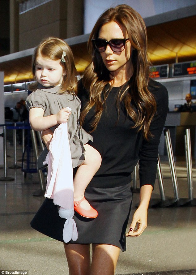 Precious cargo: Victoria made sure Harper stayed looking good as she adjusted her hair