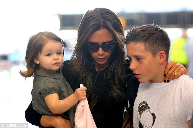 Busy body: Victoria also had sons Brooklyn, Romeo and Cruz to look after as she walked through the terminal