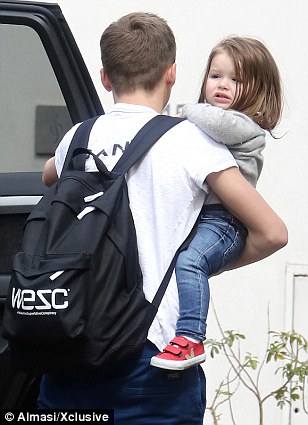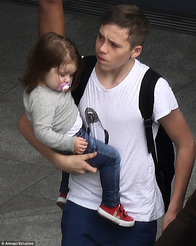 Harper Beckham is rarely seen out of her mother's arms, but on Tuesday she let her brother Brooklyn, 14, carry her around.