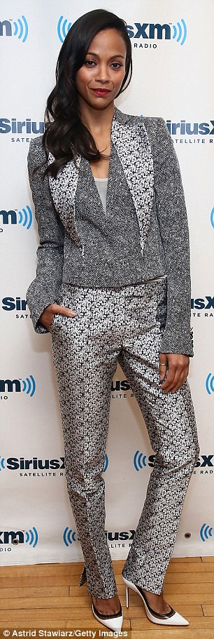 New romance: Zoe Saldana looked businesslike in a silver suit for a Sirius radio interview on Thursday amid reports she is dating Italian artist Marco Perego