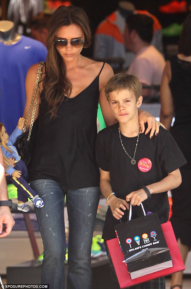 Hands-on mum: Victoria Beckham held son Romeo's hand as she took the family for a day of shopping at The Grove in LA on Monday