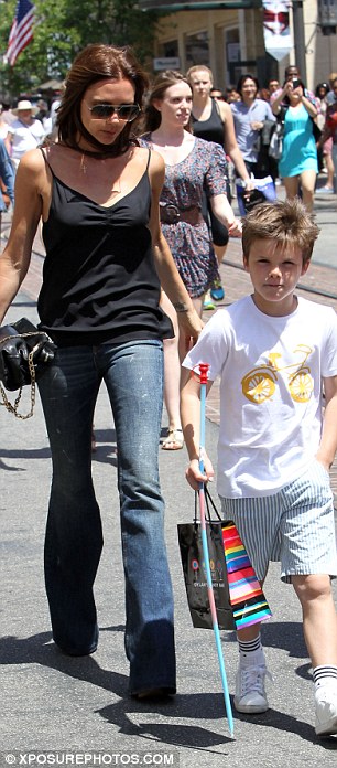 Doting mum: The former pop star carried one of Harper's toy dolls, while Romeo carried a bag from a sweet shop
