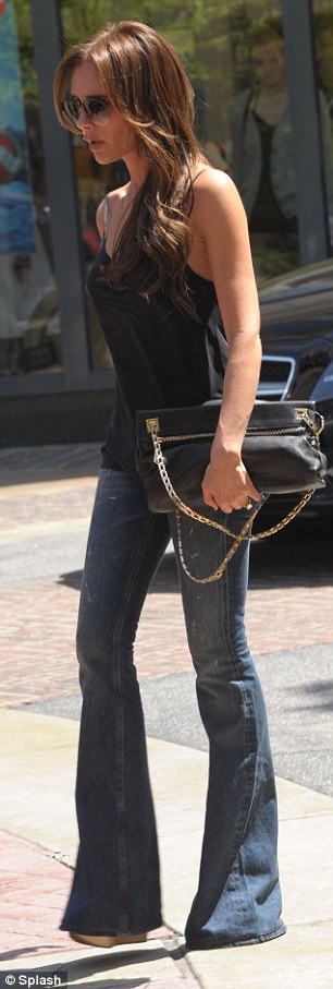Favourite flares: The fashion designer stuck to her favourite look for the day out, pairing bell-bottoms with a simple black camisole