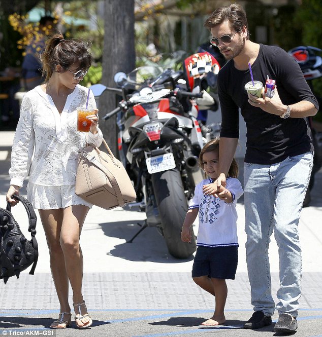 As they headed home after their meal, Scott held on tightly to Mason’s hand while he and Kourtney sipped on iced beverages.