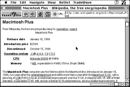 ウィキペディアのMac Plusのページを表示させてみるとこんな感じで、クラシックな雰囲気が出ていて、これはこれでアリです。