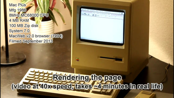 Jeff Keacherさんがインターネットに接続してみたのはCPUが8MHz、メモリが4MB・ハードドライブの容量が50MBのMacintosh Plus。ディスプレイの解像度は512×384pxで、搭載OSがSystem 7.0、ブラウザはMacweb 2.0です。