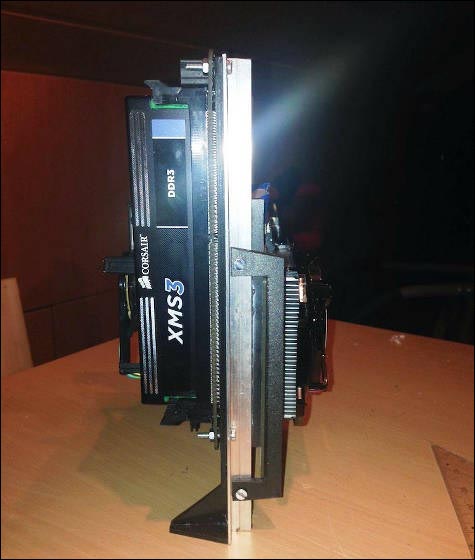 ファンの上にマザーボードを配置。グラフィックボードはライザーカード(ドーターボード)を利用して取り付けているようです。