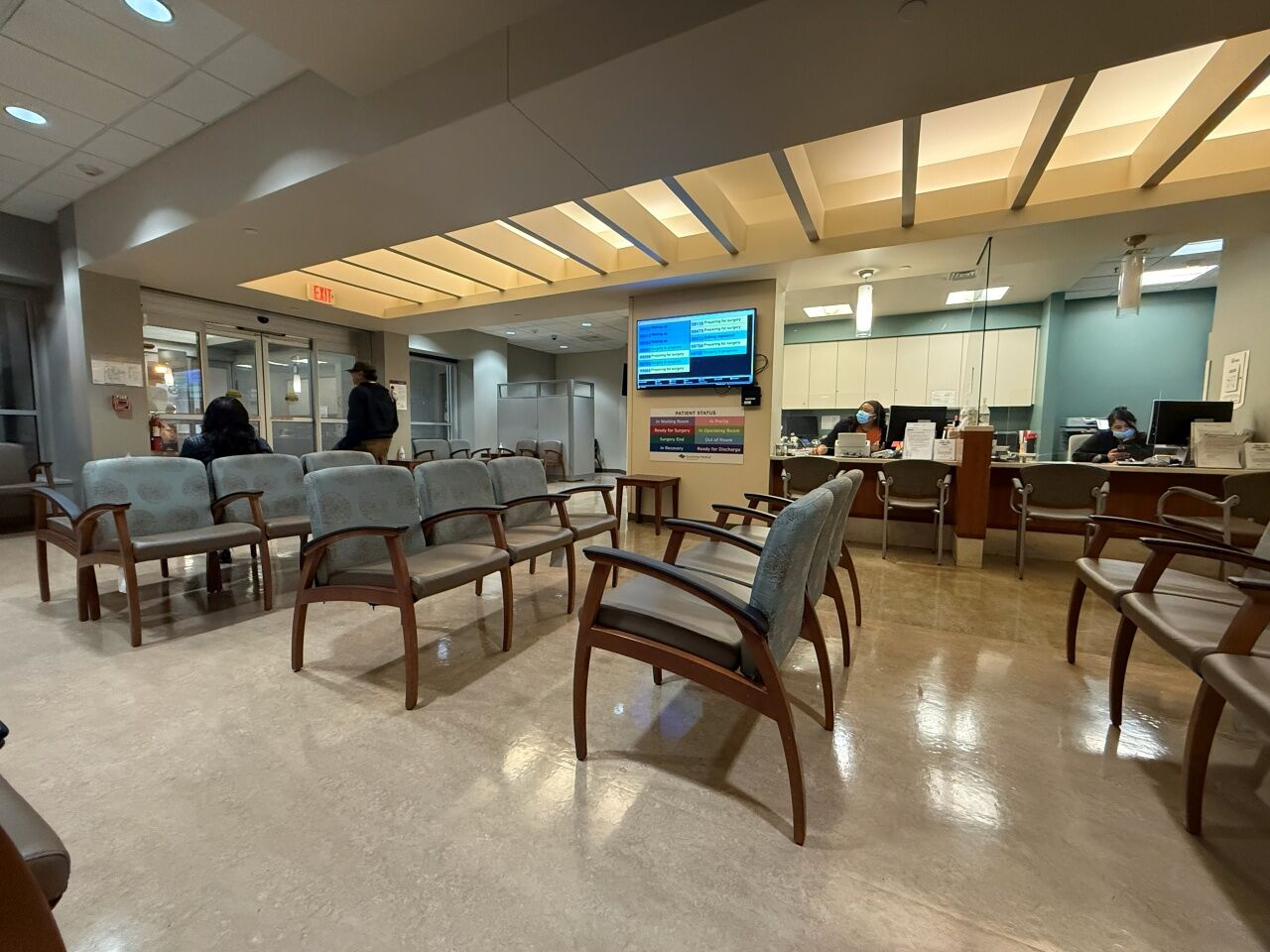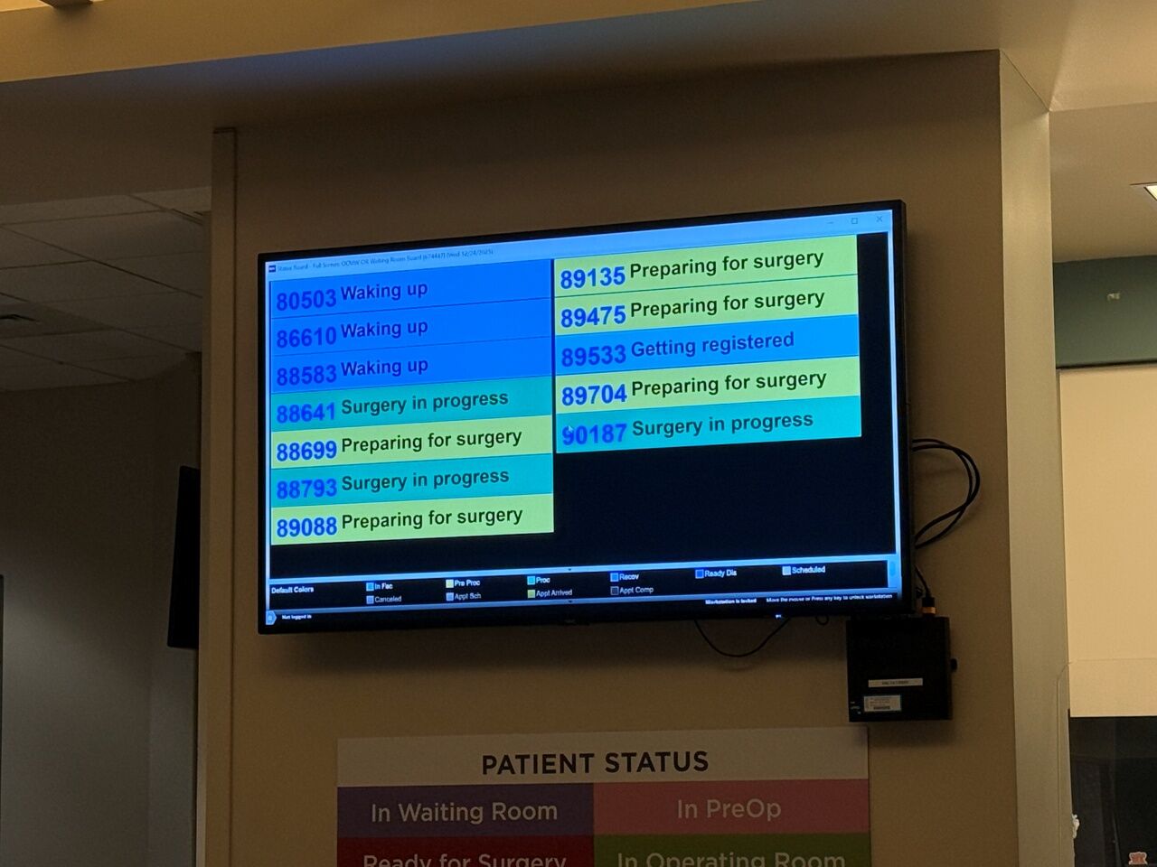 ディスプレイに処置室の状況が表示されています。流れ作業で次々に検査をしていく様子がわかります。このディスプレイシステムは来るたびに刷新されています。今回は文字が大きくて、遠くからでも見やすいです。