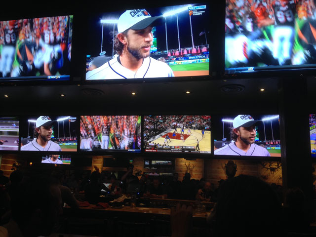 丁度ワールドシリーズの試合の真っ最中。大盛り上がりでうるさかったです。音楽のボリュームもいつもより大きめでした。