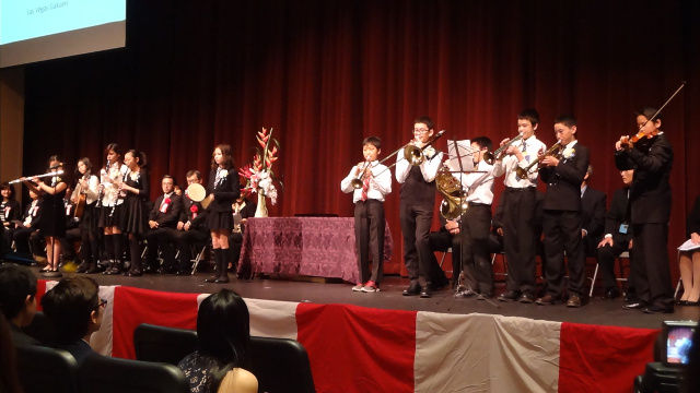 長女のいる6年生たちが校歌を演奏。もともと年度末の学習発表会で、得意な楽器で演奏しようという話だったのですが、いつの間にか話が大きくなって記念式でも演奏することになっていました。