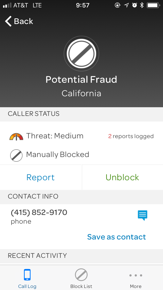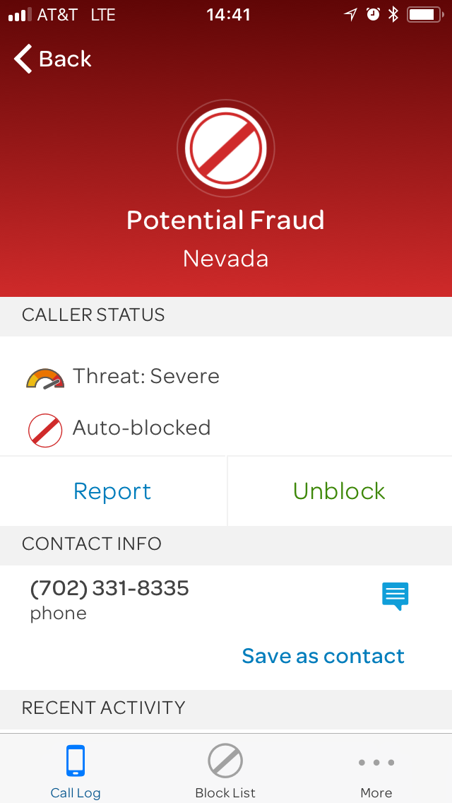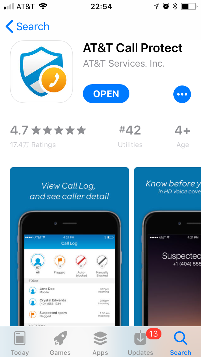 半年くらい前にインストールした、AT&T Call Protectというアプリ。迷惑電話情報共有アプリです。たぶんAT&Tのユーザー限定のアプリでしょう。