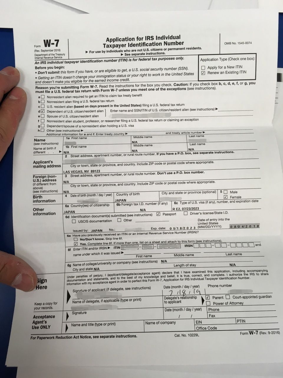 しかし米国籍がない子供はSSNを取得できません。そこで代わりにITINを取得します。