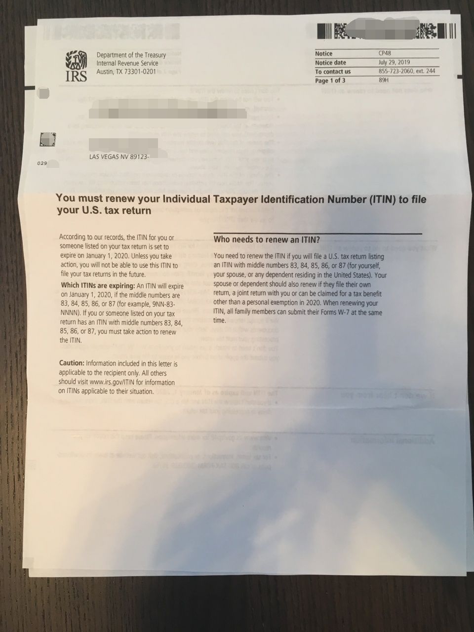 10年前に税理士事務所でお金を払って手続きしてもらったITINですが、再び手続きしてもらわないといけないようです。
