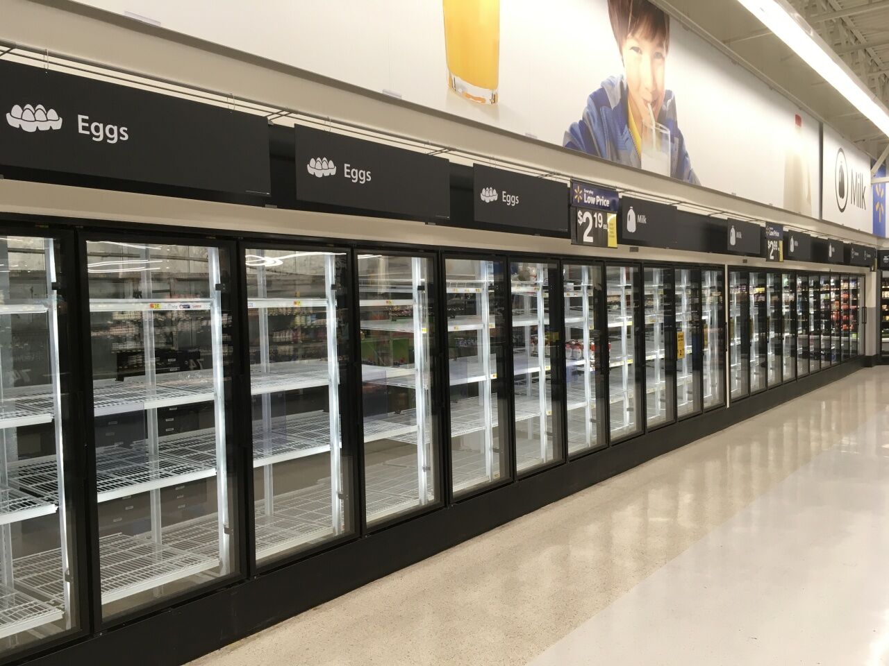 卵、牛乳、水、シリアル、ポテトチップス、冷凍ピザなどが売り切れていました。