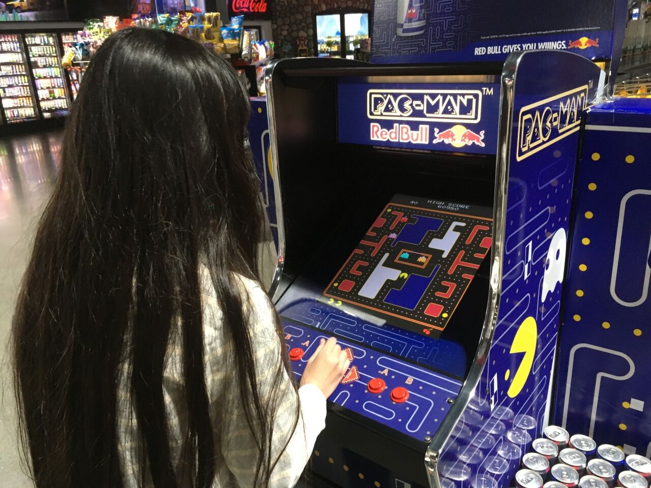 レッドブル仕様のパックマンがありました。無料で遊び放題。パワーエサの他、迷路を動き回るレッドブルの缶を食べてもパワーアップできます。