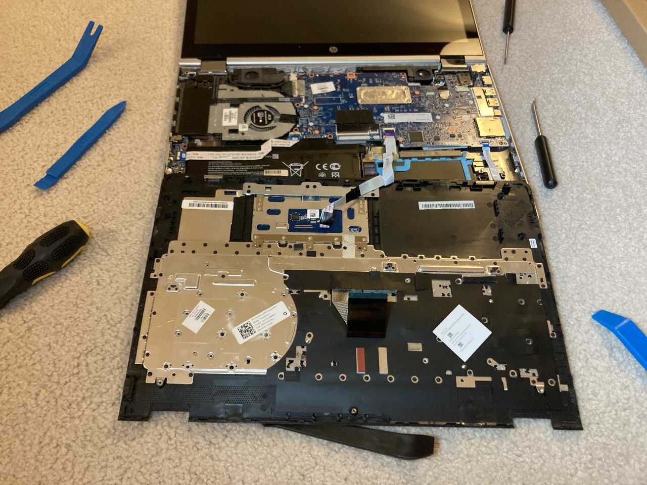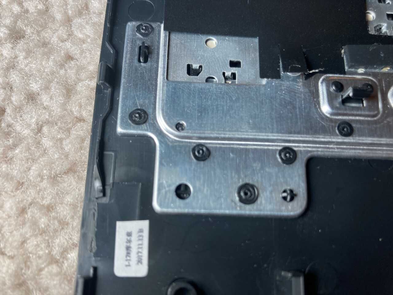 キーボードはカバーで覆われており、ネジではなくカシメで止めてありました。しかも数十個以上あります。ガチガチに固定されています。