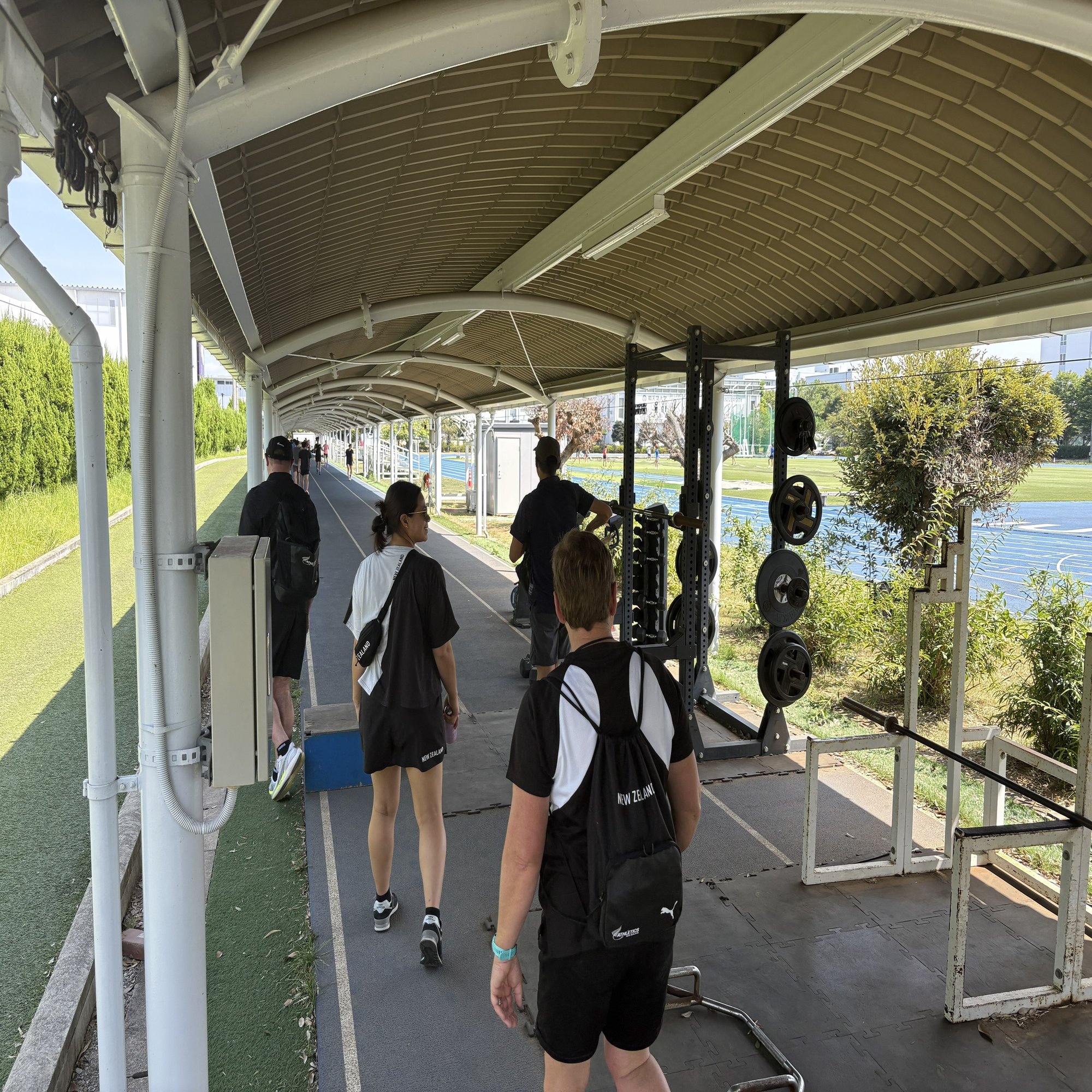 順天堂大学では、この事前合宿をご担当されている杉林先生と棒高跳コーチの岩川さんにお出迎えいただき、陸上競技場やウェイト場など、大学の主要施設を見学させていただきました。