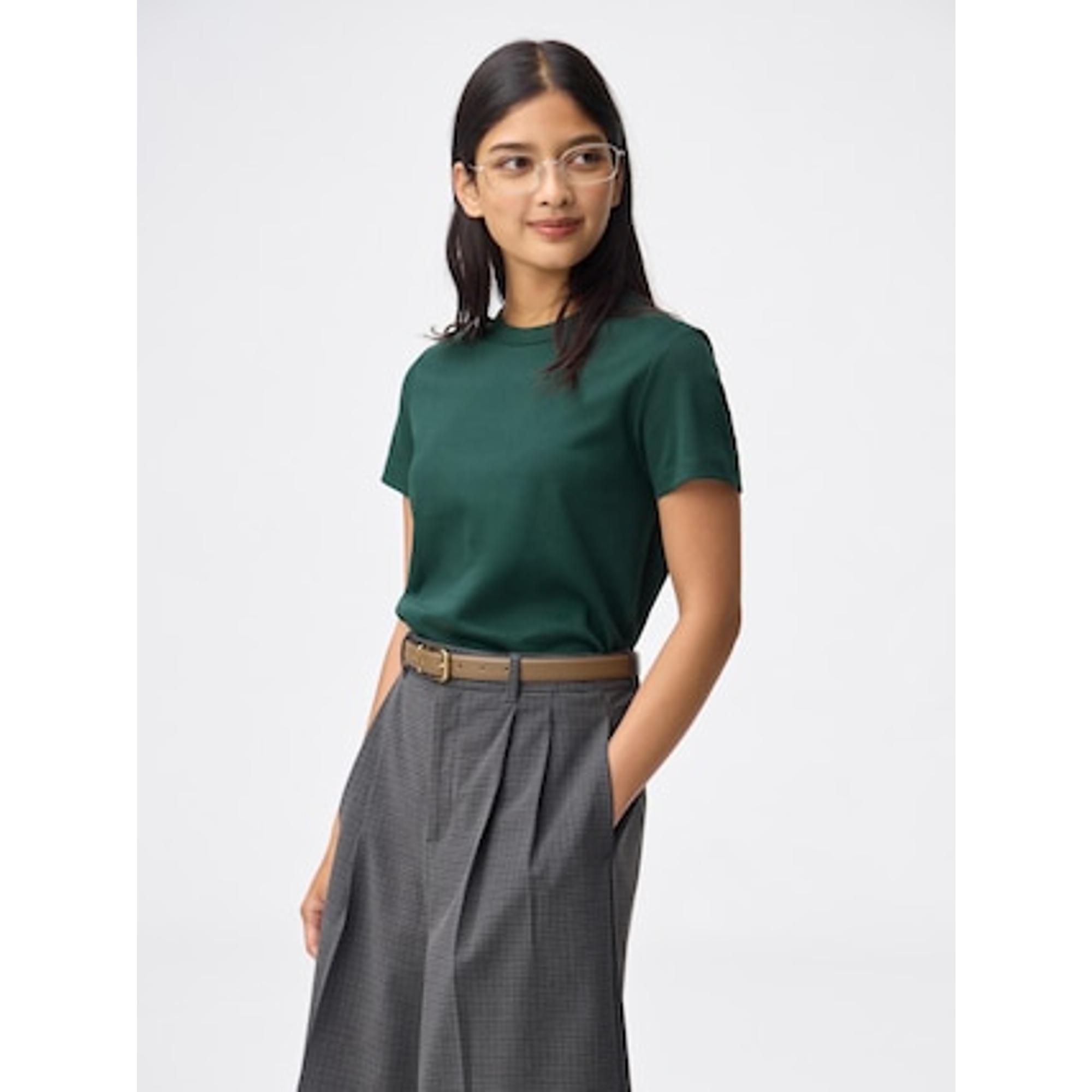 このTシャツ、無地だからこそ着回し力が抜群なんです。パンツにもスカートにも、どんなボトムスとも相性ぴったり。ジャケットやカーディガンのインナーとしても大活躍してくれます。トレンドに左右されないシンプルなデザインなので、長く愛用できること間違いなしです。