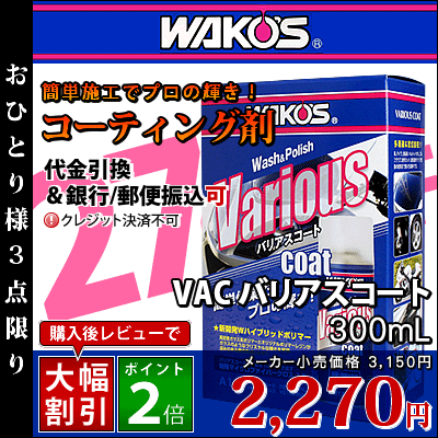 バリアスコートクレジット不可 | ワコーズ / WAKO’S VAC バリアスコート 300ml [ 洗車 ... ¥2,270 楽天 ヤフオクで、1980円で購入! 2セット・・・・ 今日は午後から洗車しようかな? トゥルットゥルにしよう! 心が折れなければ・・・・