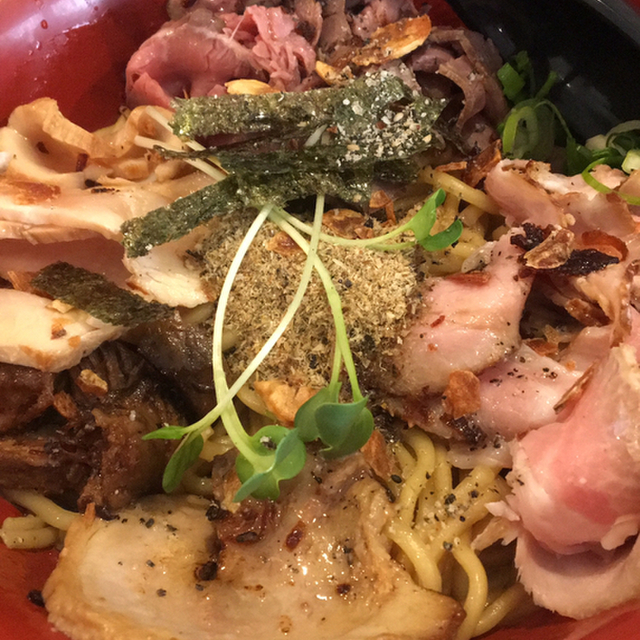 デフォルトでも器の表面は肉類で覆い隠されていて、店名にもなっている肉麺の名に恥じないインパクトを放っているのですが、肉増しにすると更に存在感が増しますね。