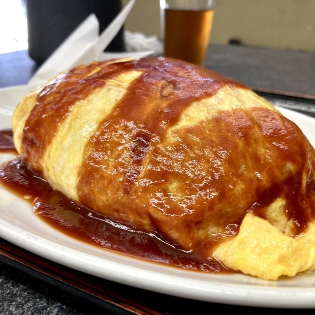 オムライスにかかっているのはトンカツソースとトマトケチャップをミックスしたようなソース。